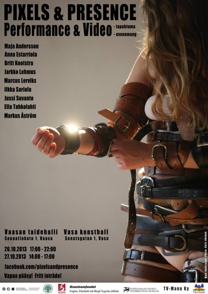 Pixels and Presence will be presented in two parts. The second part will take place in Vasa City Art Gallery 26th - 27th of October, 2013. Nine artists from Uusimaa and Ostrobothnia regions are invited to take part in the event. The artists are: Maja Anderson, Anna Estarriola, Britt Kootstra, Jarkko Lehmus, Marcus Lerviks, Ikka Sariola, Ella Tahkolahti and Markus Aström. Pixels and Presence -event is organized by video artist Johanna Torkkola, performance artist Katri Kainulainen and producer Johanna Fredriksson.